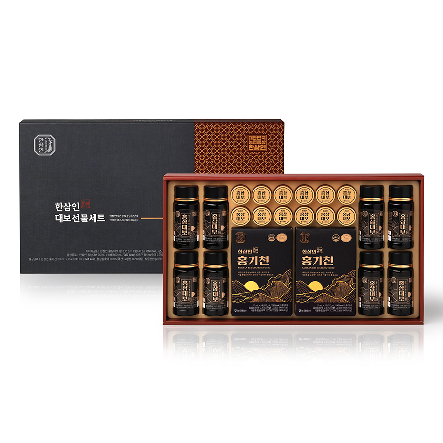 Thành phần: Nước tinh khiết, Fructose khác, Chiết xuất hồng sâm cô đặc 6 năm tuổi 0.2% (nội địa Hàn, hàm lượng chất rắn trên 60%, hàm lượng saponin tổng cộng trên 70 mg/g), *Tỷ lệ kết hợp nguyên liệu: Củ hồng sâm 70%, rễ hồng sâm 30%), Chiết xuất táo đỏ cô đặc (Hàn Quốc), Chiết xuất đương quy cô đặc (Hàn Quốc), Chiết xuất linh chi cô đặc (Hàn Quốc), Stevia xử lý bằng enzyme, Axit citric, Natri citrat tribasic, Muối ăn, Nicotinamide, Màu caramel IV, Hương liệu (Hương thảo mộc), Natri benzoat (chất bảo quản)